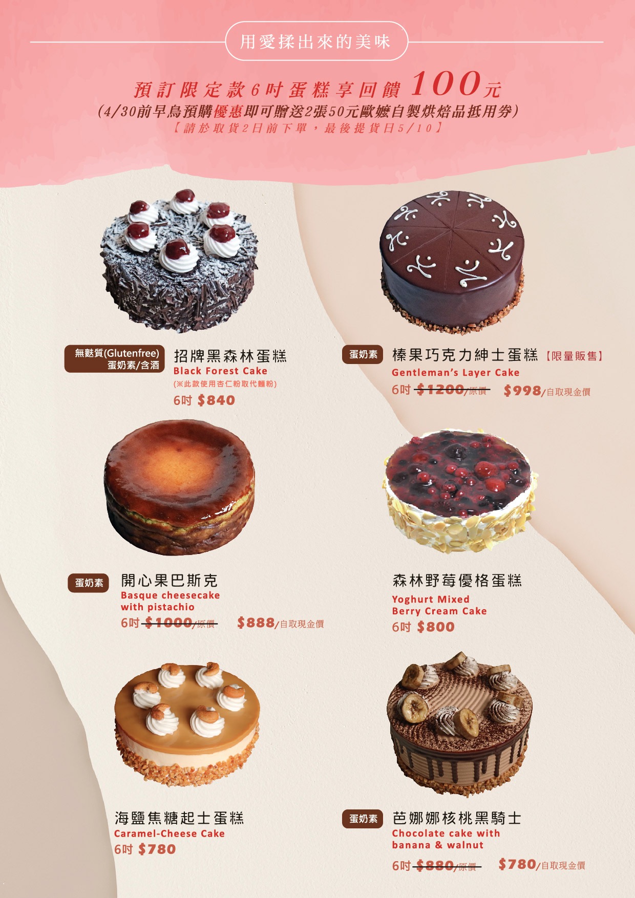 【早鳥預訂專屬優惠】 把握早鳥時間: 4/30前預訂指定款6吋蛋糕,即贈送 100元 歐嬤自製烘焙品抵用券(2張50元面額)。