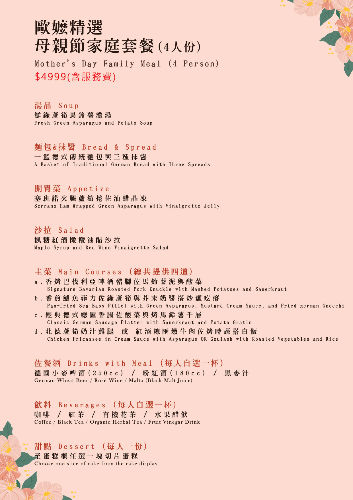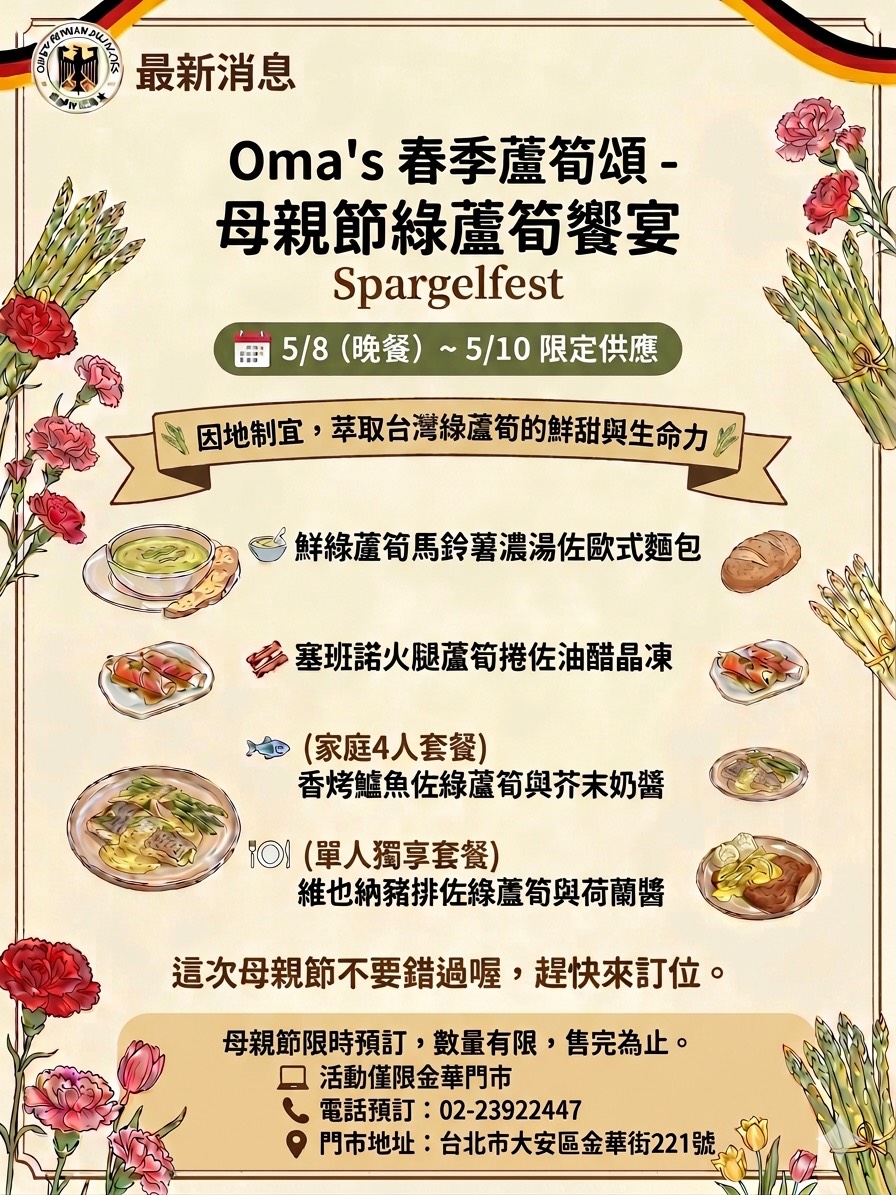 母親節檔期座位與季節食材皆有限量。請直接致電金華門市,為媽媽安排這場專屬的德式春季盛宴。
