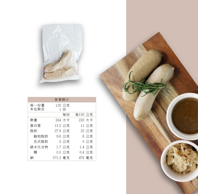 成份:豬肉、水、豬腸衣(法國)、洋蔥 、鹽巴、香料、巴西里、磷酸鈉、葡萄糖。