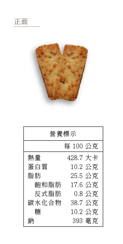 【成分】德國非基改小麥粉(小麥粉、L-抗壞血酸(維生素C)(抗氧化劑))、發酵奶油(牛乳乳脂、乳酸菌)、高達起司絲(高達乾酪(殺菌牛乳、鹽、乳酸菌、植物性凝乳酵素)、馬鈴薯澱粉)、糖、蛋、迷迭香、鹽